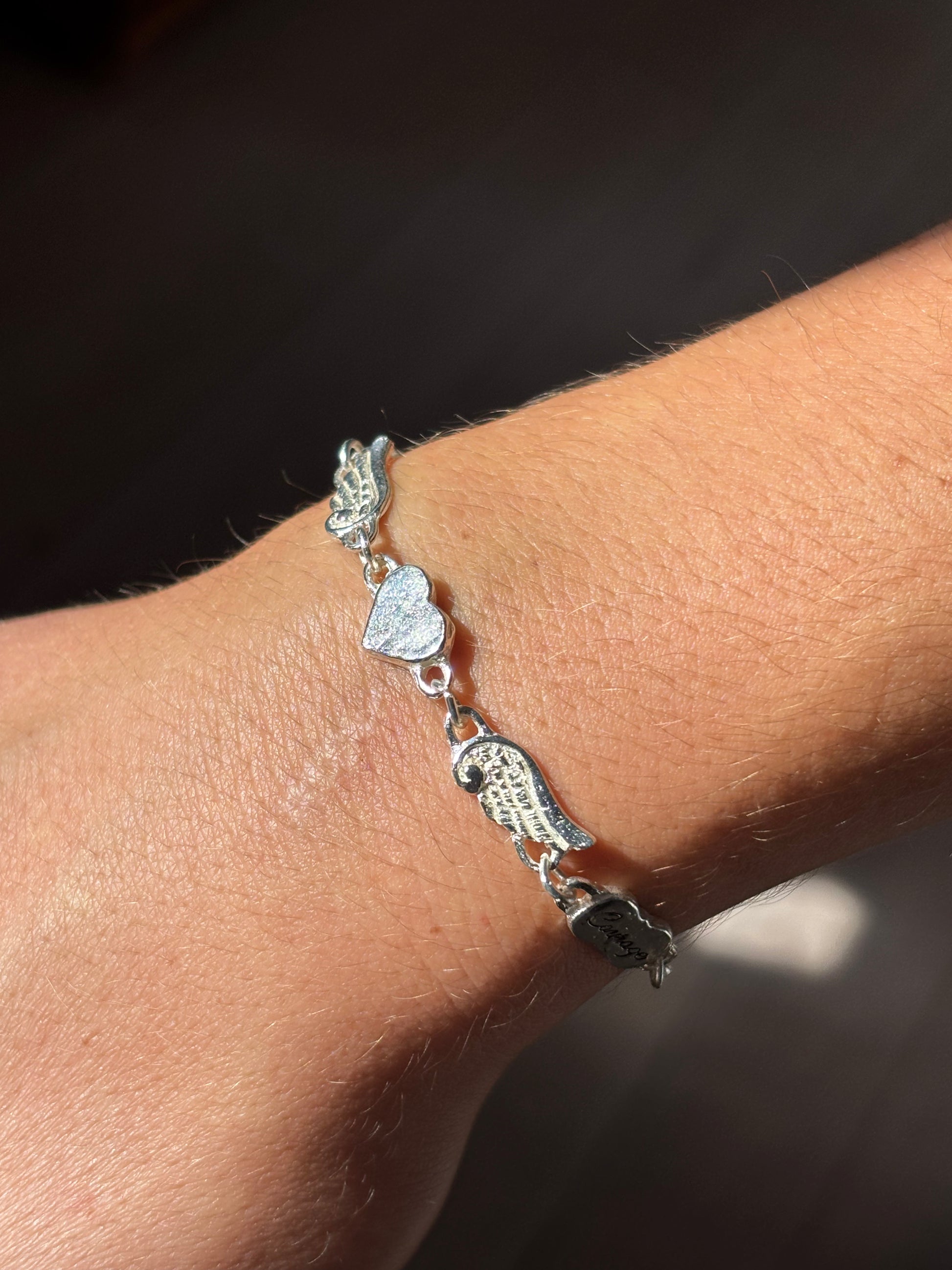 Embrace the bond of love with this elegantly designed silver bracelet, featuring a shimmering heart at its center. Framed by gracefully sculpted wings on each side, this piece captures the essence of protection, memory, and everlasting connection.
